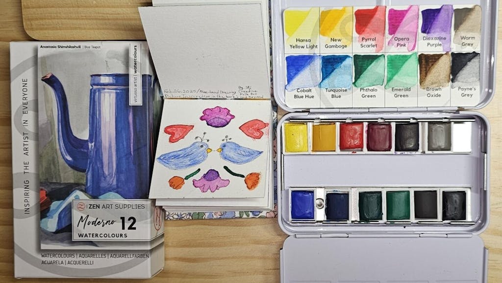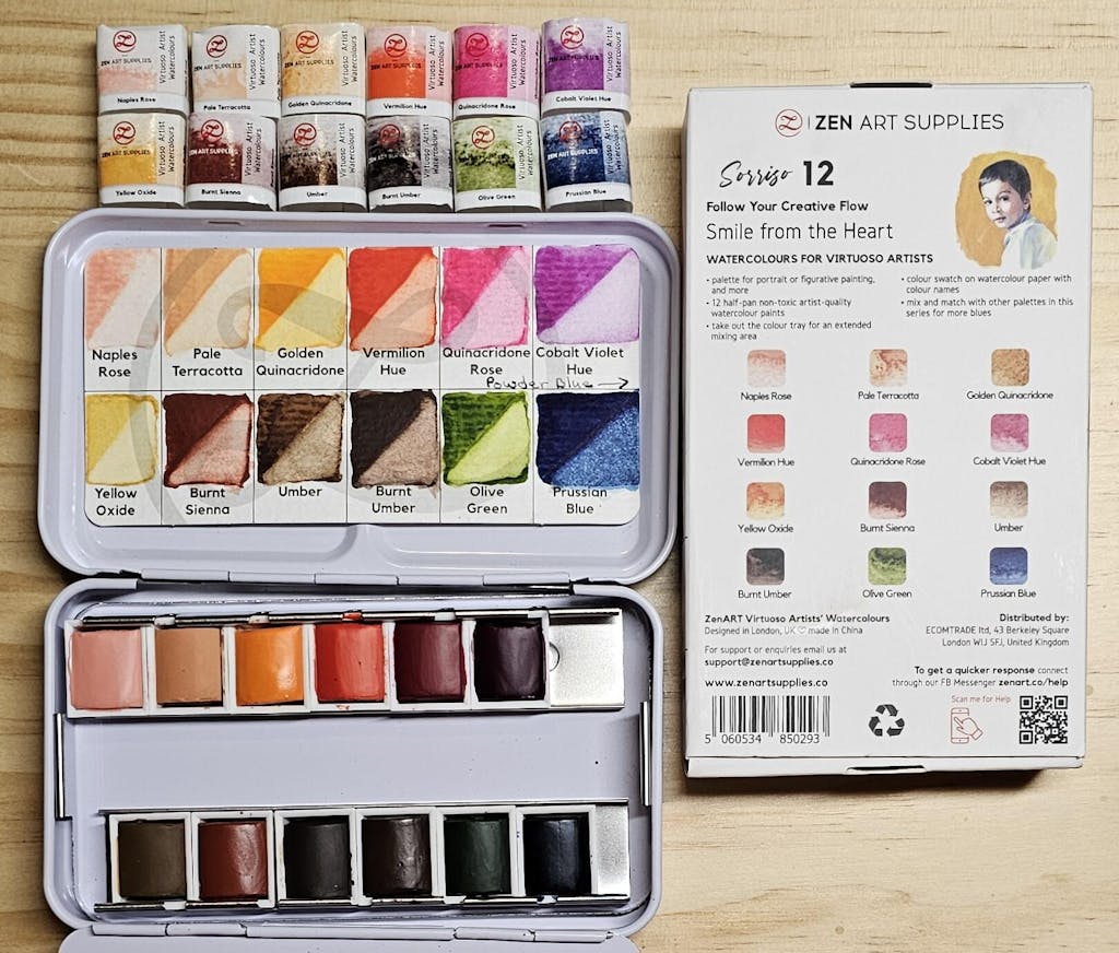 Mixing colours is one of the biggest challenges facing beginner watercolorists. With this in mind, professional artist Ardak Kassenova has selected 24 premixed hues in half pans based on years of research and testing, to avoid muddy colours and help you progress on your artistic journey.